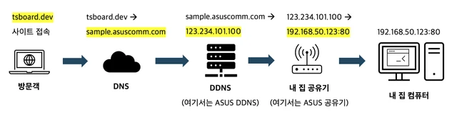 웹호스팅이나 AWS같은 클라우드 서비스를 이용하면 없어도 되는 과정 2가지가 추가되는데, 중앙에 있는 DDNS 그리고 내 집 공유기의 포트 포워딩입니다. DDNS 설정은 유/무료 서비스들이 많이 있습니다만, 저는 개인적으로 공유기 제조사에서 제공하는 서비스를 추천드립니다. KT같은 망 사업자는 주기적으로 각 가정에 할당한 IP주소들을 필요에 따라 바꾸는데, 공유기가 이를 감지해서 자기네 DDNS 서비스에 갱신을 해줄 수 있기 때문에 관리가 좀 더 편하거든요. (물론 공유기 제조사의 DDNS 서비스가 안정적이냐? 하는 것과는 별개입니다만)