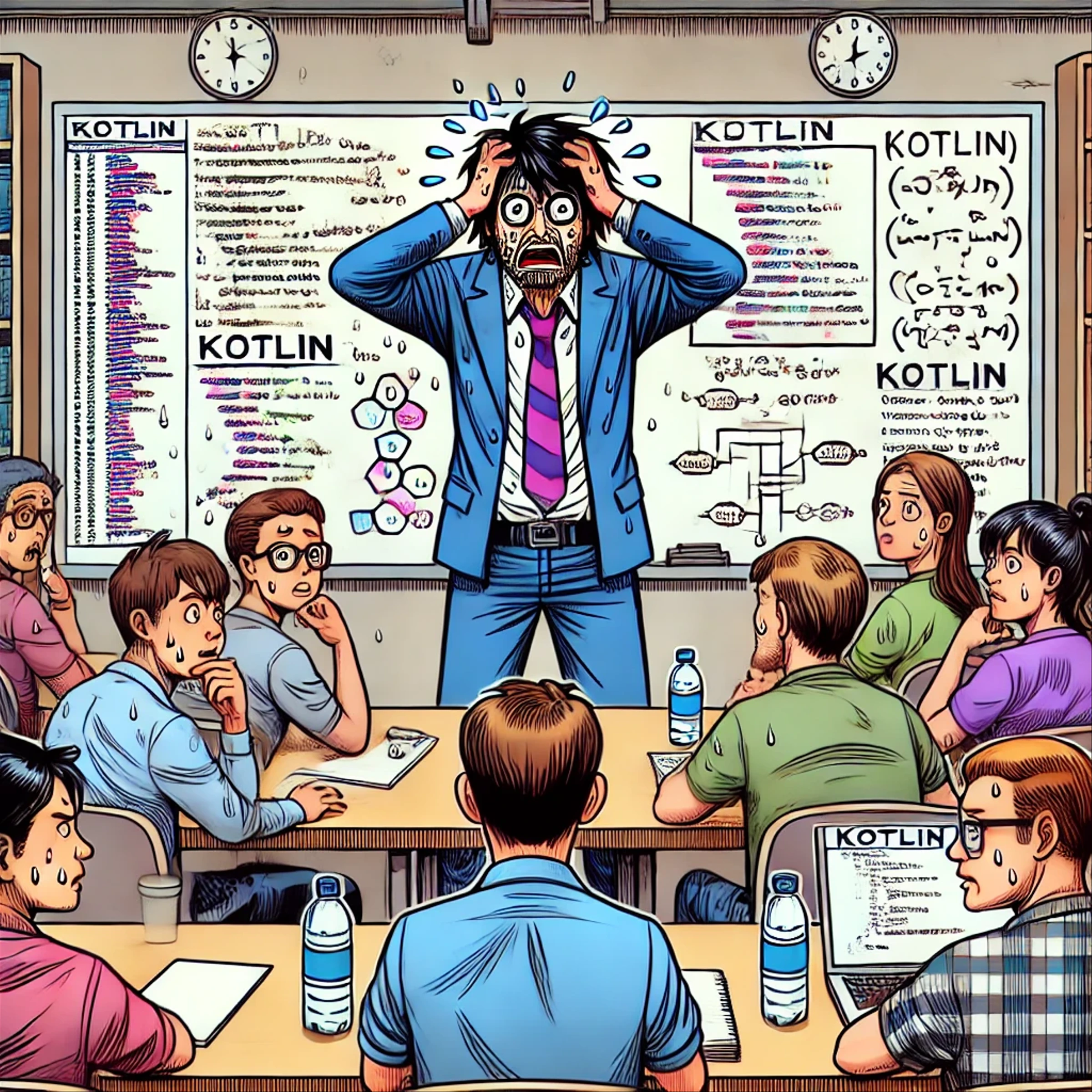 코틀린 언어는 저에게 있어서도 생소했고, 부서원들에게도 물론 생소한 언어였습니다. 부서원 대부분은 C++만 사용하고 있고, 그마저도 최근에 조인하신 분은 파이썬으로 과제 정도를 진행해 본 것이 전부인 분입니다. 그래도 저의 경우 TSBOARD 프로젝트를 진행 하면서 Go 언어를 배우고 사용할 기회가 있었고, 타입스크립트(자바스크립트) 언어도 사용해서 그런지 문법이나 개념들이 크게 어려워 보이진 않았습니다. 즉 다른 언어를 사용하면서 무의식중에 체득한 지식들 상당수가 코틀린 언어에서도 그대로 적용된 것입니다. 그래서 처음에는 다른 동료분들에게 제가 배운 내용을 설명하는 것이 그렇게 어려울 거라고 생각하지 못했습니다. 제가 이미 아는 개념이 코틀린에서는 어떤지 파악한 다음, 그 내용을 잘 녹여서 설명하면 될거라고 (안이하게) 생각했던 거죠.